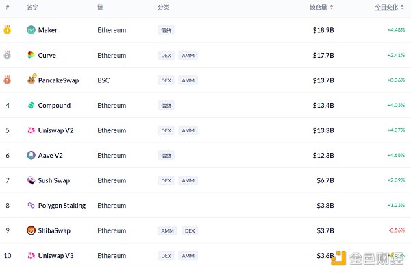 DeFi項目鎖定資產前十排名及鎖倉量,數據來源:Debank