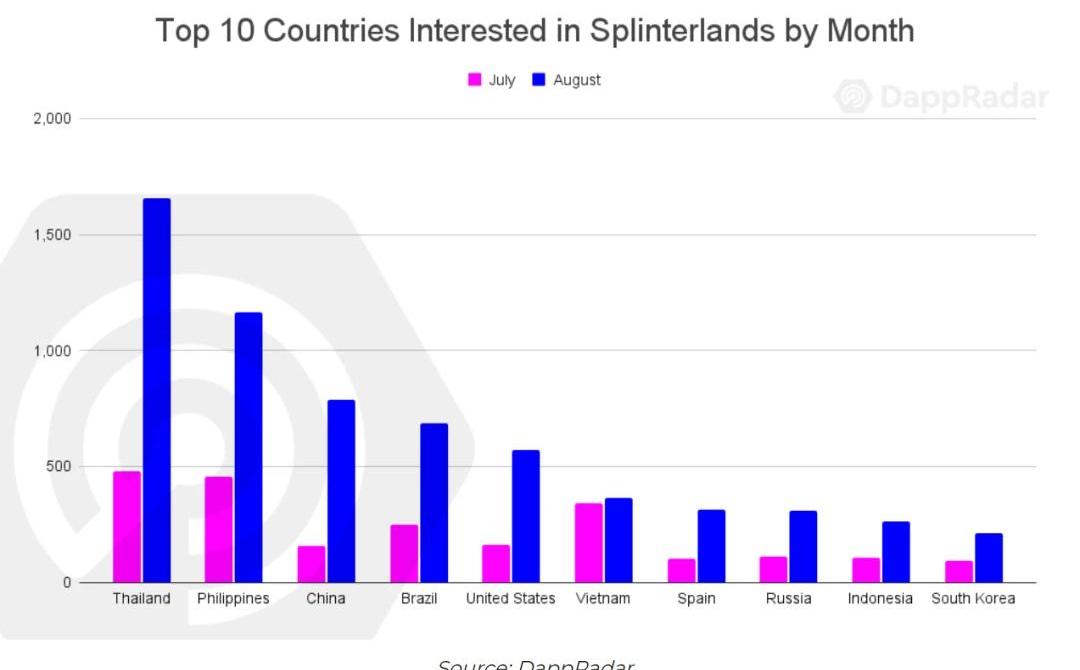 這五個國家也是Splinterlands的點擊率領導者。該應用的使用量按月大幅增長554%,在8月吸引了超過187,000個UAW,成為行業中游戲人數最多的游戲之一。