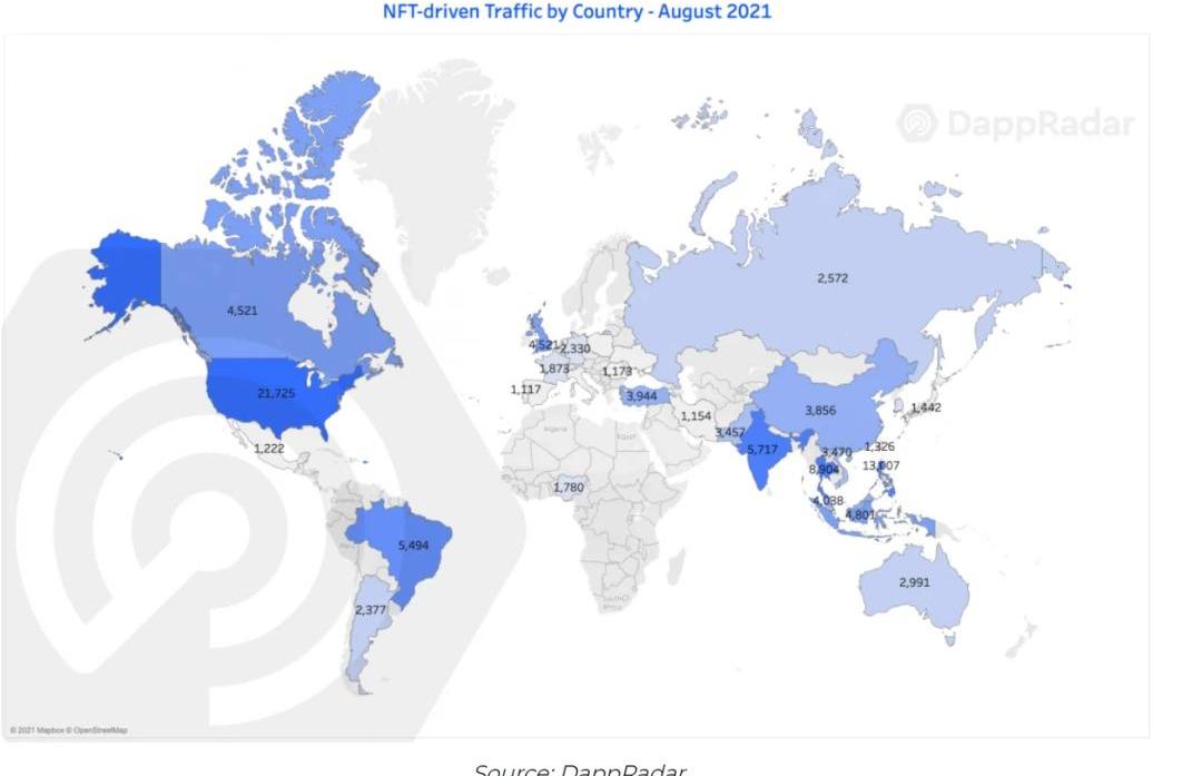 區塊鏈游戲與NFT空間有很大的交集,因為區塊鏈游戲中的項目甚至是可玩的角色都是由這些不可偽造的代幣代表的。因此,分析NFT空間在游戲的角度上又增加了一個分析層。8月是NFT空間有史以來最好的一個月。美國,這個對NFT最感興趣的國家,以很大的優勢,也看到其NFT受眾的增長。美國代表了全球最重要的市場之一,對體育、收藏品和紀念品有著巨大的需求。泰國、印度和英國是排行榜的后幾名。菲律賓也是領先者之一,其大部分流量來自于AxieInfinity。