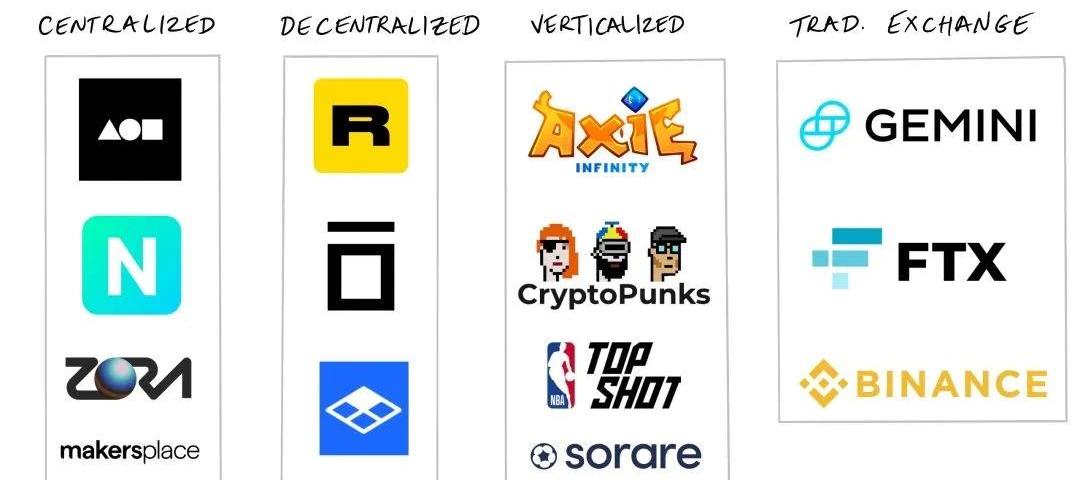 現在,OpenSea的領先優勢看起來幾乎是無懈可擊的。雖然它的產品和選擇使其具有防御性,但它在一個初期的、高度活躍的市場中運作。這為各種競爭者留下了空間,包括中心化NFT市場、去中心化市場、垂直市場和加密貨幣交易所。