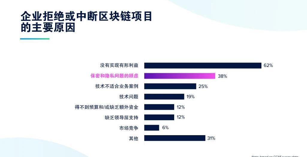 似乎世界上每家大公司都在準備進入區塊鏈世界,并開始使用NFT。然而,還有一個嚴重的問題,這個可能會阻礙企業去大規模地使用區塊鏈技術,這個問題那就是隱私。長期以來,區塊鏈技術因其交易記錄在分布式賬本上的偽匿名性質而受到批評。雖然公共區塊鏈的透明度對于檢測欺詐和降低中間人之間的信任成本非常有用,但它帶來的缺點是確保每個人都可以看到您正在交換的內容并合理準確地確定您正在與誰進行交易。在高度重視自由裁量權和保密性的競爭性行業中,由于偽匿名而失去競爭優勢的高額代價,不值得讓企業去冒險使用區塊鏈技術。事實上,根據劍橋大學關于企業區塊鏈采用的一項研究,企業區塊鏈項目被終止的第二大常見原因是出于對機密性和隱私的擔憂: