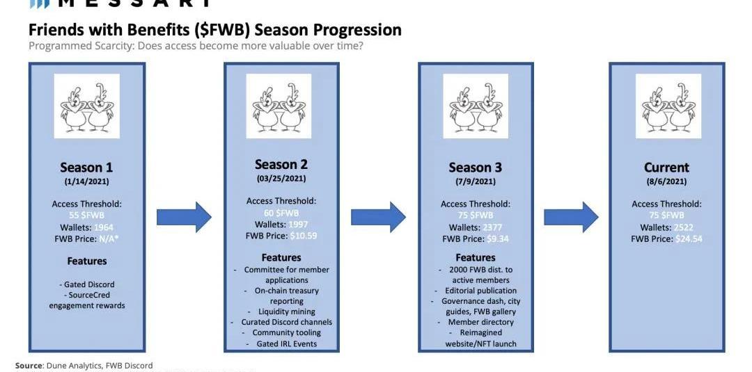在社區DAO環境中,訪問是稀缺資源。它是運行引擎的燃料。人們對獲取的重視既是社區力量的原因,也是其影響。簡而言之:社區推動了獲取的價值,這產生了對包容性的需求,并進一步鞏固了社區的規模和實力。在解碼社區的實力和訪問價值之間的具體關聯時,我們可以看看FWB的分層進展模型。FriendswithBenefits生活在Discord上,既提供內容,也是社區的蜂巢。第一季推出時,會員需要50個FWB代幣才能獲得進入discord的權利。隨著社區規模擴大,訪問門檻和相關的福利也在增加。第3季在幾周前啟動,需要75個FWB才能進入。那些參加FWB的第三季的人可以從一些額外的好處中獲益,比如一個封閉式的IRL事件,優質的子堆棧內容以及精心策劃的城市指南。由于訪問逐漸變得越來越稀缺,因此這些特權之一無疑是排他性。