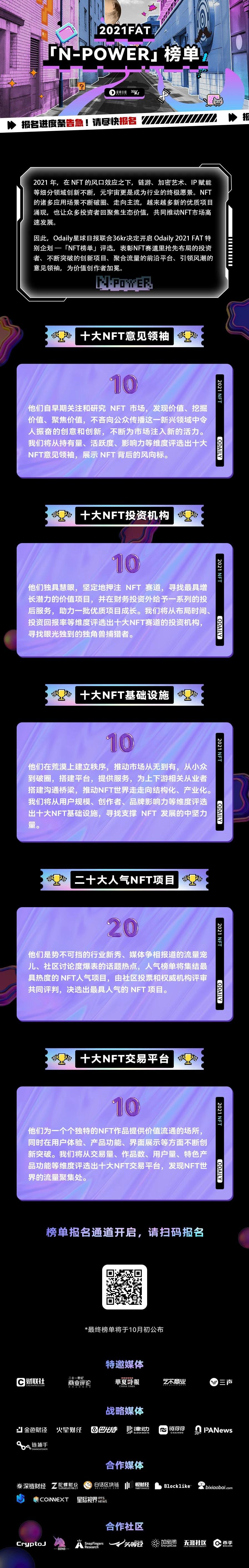 2021年,在NFT的風口效應之下,鏈游、加密藝術、IP賦能等細分領域創新不斷,元宇宙更是成為行業的終極愿景。NFT的諸多應用場景不斷破圈、走向主流,越來越多新的優質項目涌現,也讓眾多投資者回聚焦生態價值,共同推動NFT市場高速發展。因此,Odaily星球日報聯合36kr,決定開啟Odaily2021FAT特別企劃—「NFT榜單」評選,表彰NFT賽道里搶先布局的投資者、不斷突破的創新項目、聚合流量的前沿平臺、引領風潮的意見領袖,為價值創作者加冕。