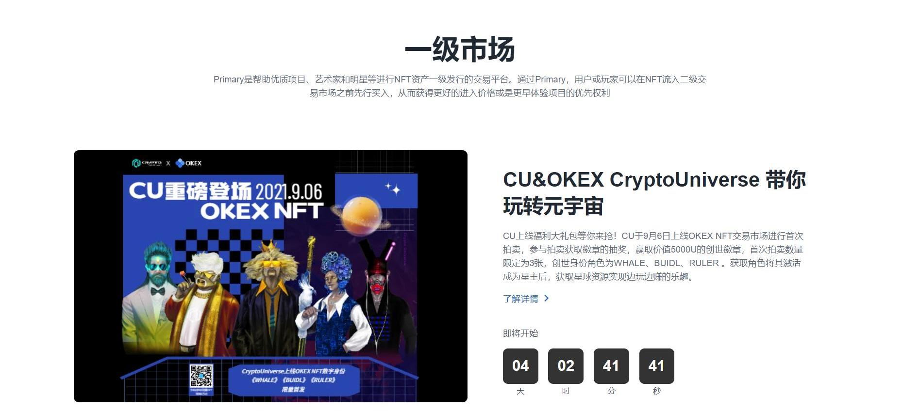 圖片來源:OKExNFT官網作為專注NFT領域的一站式交易平臺,OKExNFT還將聯合藝術家、創作者、名人明星等首發各類優質NFT資產,允許用戶在一級市場直接搶購NFT。據官網顯示,OKExNFT已開辟三個板塊:一級市場、交易市場、我的NFT。·一級市場