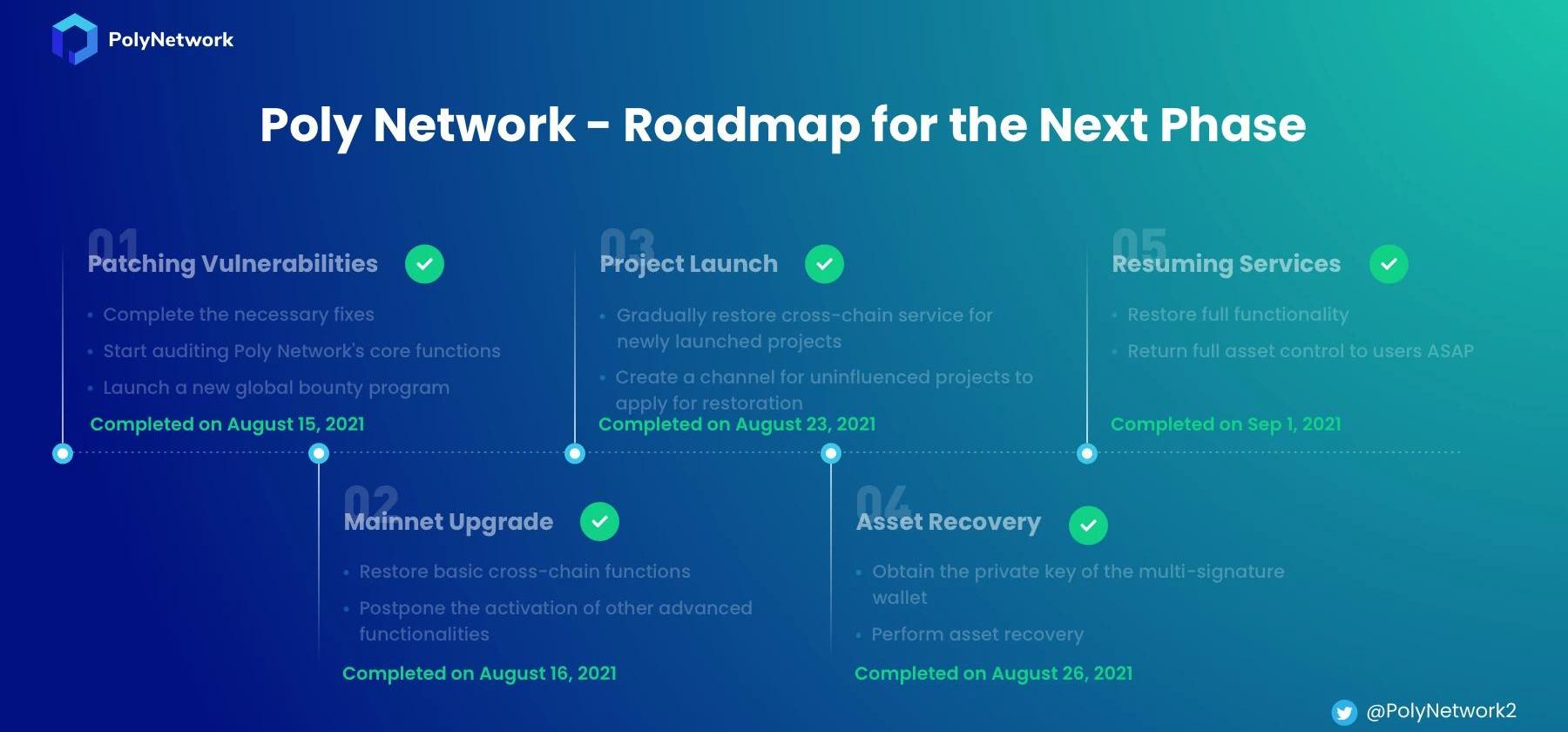 安全一定不是一蹴而就的事,對于網絡安全,此次事件已經凝聚了全行業最直接深刻的體會。https://twitter.com/PolyNetwork2/status/14261973611774935118月15日,在確定并公布恢復計劃后,團隊開始持續推進和落實路線圖中的工作,包括在immunefi的平臺上發布了總額為50萬美金的安全賞金計劃,希望吸引全球安全機構和白帽組織為PolyNetwork的安全助力,當然這只是安全的第一步,系統恢復期內我們也:l邀請白帽先生作為PolyNetwork的首席安全顧問并提供160ETH安全賞金https://twitter.com/PolyNetwork2/status/1427574236483231749l與PeckShield、BlockSecTeam、Beosin(ChengduLianAnTech)等安全機構確認修復和重啟方案1)PeckShield:https://peckshield.medium.com/polynetwork-bug-review-and-patch-analysis-88bde84412972)BlockSecTeam:https://blocksecteam.medium.com/the-informal-security-review-of-the-patch-of-the-poly-network-1a0a532b731e3)Beosin(ChengduLianAnTech):https://beosin.medium.com/boesins-analysis-of-the-fix-code-on-poly-network-smart-contracts-a305639ea626https://medium.com/poly-network/latest-updates-aug-20-a12447c6d899https://medium.com/poly-network/latest-updates-aug-19-ed7ab8e5c2f0https://medium.com/poly-network/latest-updates-aug-17-241398d64a40同時我們也想引用白帽先生闡述的對區塊鏈安全的一些建議,我們覺得在一定程度上是中肯客觀的。https://etherscan.io/tx/0x078063e9574e1937a64b6552919b9fc0035429df1e601d79e200bf211e75f337https://etherscan.io/tx/0x42446ccc66bb48eac7bd905ae7d79708f303849802b280eb4d65770c1bfc0997我們相信協議的安全始終是重要的一環,但是我們也相信在crypto的世界里,代碼之上仍有更廣袤和豐富的存在,或許大家有著不同的價值觀和知識儲備,但是依舊可以公平的參與到這個世界建設和治理里,我們在未來想建立的不僅僅是一個安全的協議,更是一個對所有人公平透明的協議。所有的代幣都還給你了所有的故事都會有一個尾聲,很欣慰,這次的故事是一個HappyEnding。l8月19日,白帽先生歸還了Ethereum上的96,942,063個DAI。l8月22日,除wBTC和ETH資產已盡數歸還。PolyNetwork開始進行穩定幣的資產清點和復原,以協助O3Hub的功能恢復。l8月23日完成了白帽先生返回的96,942,063個DAI與USDC之間的轉換,同時將BSC上的87,557,051個BUSD轉換為USDC(BEP-20)。對于在交易中產生的滑點損耗和手續費,PolyNetwork團隊用自有資金進行補償。https://etherscan.io/tx/0x814e6a21c8eb34b62a05c1d0b14ee932873c62ef3c8575dc49bcf12004714edahttps://medium.com/poly-network/latest-updates-aug-23-7f6cca47b574l8月23日白帽先生公布了多簽錢包的私鑰。https://twitter.com/PolyNetwork2/status/1429738587046563841l8月25日,此次攻擊事件受影響的WBTC和ETH資產全部恢復。https://twitter.com/PolyNetwork2/status/1430485302527741954l同日,Tether將此前凍結的33,431,200USDT資產全數釋放至PolyNetwork接收資產的多簽錢包內。https://twitter.com/Tether_to/status/1430510652582416387l8月26日,PolyNetwork完成USDT資產的復原工作。至此,所有受此次攻擊事件影響的資產恢復完畢。https://medium.com/poly-network/poly-network-asset-recovery-complete-a7ba33c2f2e4