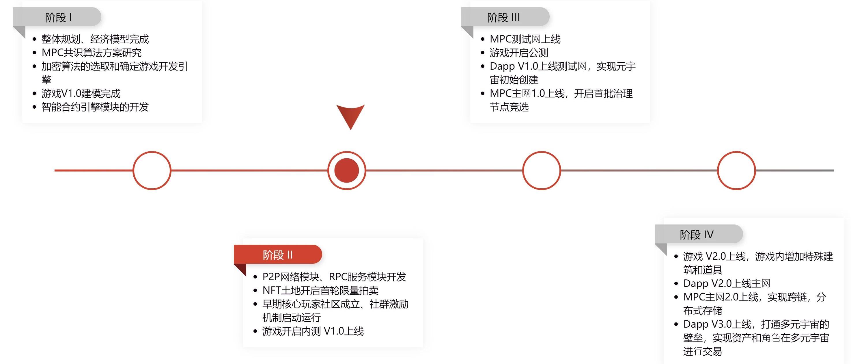 目前MPC將分四個階段推進項目:階段1:完善項目經濟模型,確定共識算法,開發初版游戲以及重要的智能合約引擎模塊。階段2:開發P2P網絡模塊和PRC模塊,完成首輪3000個土地NFT的拍賣,以及早期項目的冷啟動+游戲內測。階段3:上線MPC測試網,開啟游戲公測,并最終完成主網1.0版本的上線。階段4:游戲V2版本的更新,MPC主網2.0實現的跨鏈和分布式存儲的功能,DappV3上線,完善更多元宇宙的功能。
