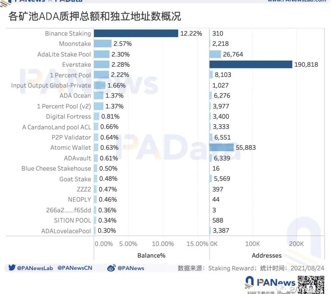 鏈上數據已經表明今年ADA暴漲的背后是鏈上用戶規模和交易規模共同推動的結果。不過,不可忽略的另一大因素是,Cardano作為PoS類代幣,Staking機制也為ADA幣價走強提供了一定的支撐。根據StakingReward的數據,截至8月23日,參與ADA質押的地址數量超過了75.65萬個,質押的代幣總數約占總流通量的69.8%,質押總額達到了671.27億美元,成為所有Staking代幣中質押總額最高的一個。根據質押總額的高低,PAData選擇了20個最大的ADA質押市場來進一步分析質押情況。根據統計,BinanceStaking的質押總額達到了82.08億美元,占總質押額的12.22%,是目前最大的ADA質押市場。其次,Moonstake、AdaLiteStakePool、Everstake、1PercentPool、InputOutputGlobal-Private的質押總額也都在10億美元至20億美元之間,占質押總額的比例在1.6%至2.6%之間。20個最大的ADA質押市場的總質押額占比約為32.32%,這意味著,ADA的質押市場相對較分散,除BinanceStaking以外,其余頭部市場的集中程度并不高。