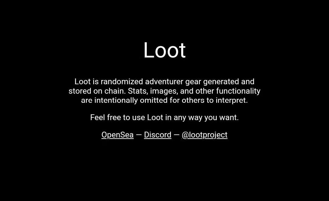 1.Loot很獨特Loot官網的干凈程度在NFT項目中并不多見。兩段話、OpenSea鏈接、Discord鏈接、推特賬號,這就是官網的全部,與NFT的風格一脈相承。