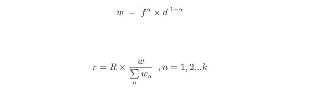 除了初始空投獎勵外,dYdX還將初始代幣供應量的25%分配給在未來5年內在dYdXLayer2協議上進行交易的用戶,每個epoch周期將分配3,835,616DYDX代幣。以下是具體分配涉及到的函數公式: