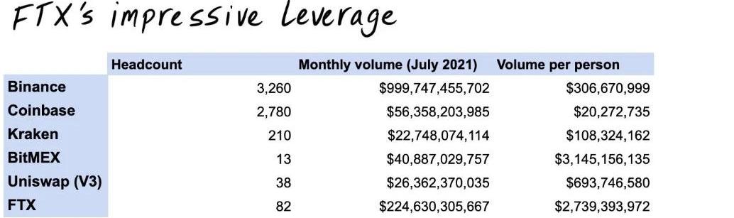 也許FTX管理中最讓人震驚的是其所取得的高能效杠桿作用。該公司僅有82名員工,卻能運營世界上最大的加密貨幣交易所之一,以只有幣安才能跟上的速度推出新產品,并簽約了一系列熱門合作伙伴。這簡直令人瞠目結舌。可以看一下這張表的對比: