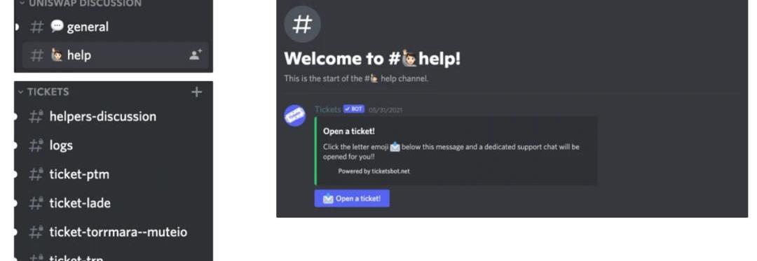 迄今為止,支持請求構成了UniswapDiscord中最大的活動類別。作為支持熱線,Discord可幫助社區成員解決有關功能、詐騙和使用Uniswap應用程序的基本問題并獲得解答。通過這種方式,Discord用戶被視為有權及時回答他們的問題和疑慮的客戶——因此,他們也可能開始以這種方式看待自己。有6個特定于支持的頻道專用于各種支持主題,但支持請求也會擴展到大多數其他頻道。為了響應大量的支持請求,Serv.Eth和版主團隊集成了一個半自動票務系統,ticketbot.net。當提出支持請求時,版主會向機器人中的/tag發出關鍵字命令,然后提示用戶通過Ticketbot打開一個專用的支持頻道。這些「ticketbot」創建了一個版主可以看到的私人支持頻道。