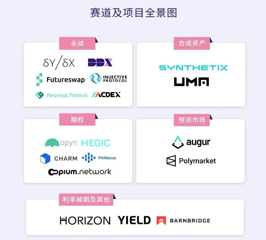 首先我們對當前去中心化領域的衍生品進行定義,主要分為四個大類即期貨,目前的主要有PerpetualProtocol、dYdX、Futureswap、InjectiveProtocol、MCDEX、derivaDEX等;期權有Opyn、Hegic、Charm、Opium等;合成資產有Synthetix、UMA、Mirror、Duet等;預測市場有Augur、Polymarket等;利率掉期有Horizon、Yield、Barnbridge等等。本文主要從期貨和合成資產的角度來對去中心化衍生品進行分析。