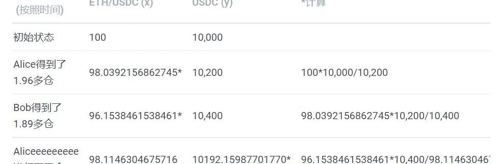 主流去中心化衍生品平臺GMV數據來源:Tokenterminal該流派中以PerpetualProtocol為代表。根據Messari的數據統計PerpetualProtocol在永續合約賽道中市占率達到76%,其七月份的收入規模在所有Defi項目中排名第七,僅次于Sushiswap。但是,因為今年2月份開啟的交易挖礦導致的刷量行為貢獻較難計算,其交易量和收入的情況不能準確反映其真實的市場占比。PerpetualProtocol采取的模式是構建虛擬的流動性池子vAMM,其本質是根據X*Y=K的公式來進行模擬定價,交易者通過提供保證金USDC注入資金池,不需要外部的流動性提供者。這種方法也是一種合成資產的鑄造路徑,并不產生實際的兩種貨幣的代幣兌換,因為資金池中只有USDC,而進出資金的數量與收益情況是根據入場和出場時該交易對的價格通過數學公式進行計算得出。這里我們引述項目方的文件來進行舉例:X*Y=K,ETH和USDC的價格為Y/X=100;Vault池子中有10000USDC,X=100,K=100*10000,Alice使用100U注入兩倍開多ETH;由于Alice注入100U并且兩倍開多后,池子將頭寸計入Y變為10000+100*2=10200U,ETH和USDC的匯率變為100*10000/10200=98.04;Alice實際ETH倉位變為100-98.04=1.96;