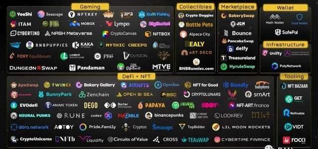 BSCNFT生態圖景來源:BSC顯而易見,如果說以往的加密市場是以太坊“單打獨斗”,那么在DeFi和NFT高速發展下,以幣安智能鏈BSC為首的新晉者正在加速重塑市場格局。