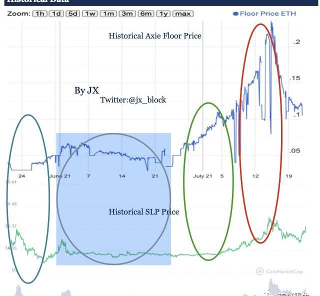 上圖與美林投資時鐘非常相似。游戲的內部經濟周期在四個階段的表現有些相似階段1->階段2游戲剛剛上線,內部經濟玩家寥寥無幾。資產價格保持低位,但由于早期采用者購買AXS代幣和AxieNFT開始游戲,因此出現了初步上漲。階段2->階段3游戲的早期玩家開始相互競爭,并開始購買更多的AXS和NFT以進行激烈的競爭。這從根本上增加了對標的資產的需求。項目成功的傳言廣為流傳。第3階段->第4階段該游戲現已進入主流媒體視野。記者將Axie描述為工作的未來以及基礎資產向泡沫領域發展的趨勢。新玩家開始玩游戲的成本高得令人望而卻步。大量資金被用于啟動大規模育種業務,為NFT設定了一個臨時的更高底價。但是NFT的供應增加從而拉低價格。第4階段->第1階段由于投資回報較低,僅出于商業目的玩游戲的玩家開始完全退出游戲。這使價格回到了真正喜歡使用該產品的新玩家可以重新進入的水平。事實上,這實際上已經在AxieInfinity上實現了。了解如何考慮以下數據,將AxieNFT的底價與SLP的價格進行比較。