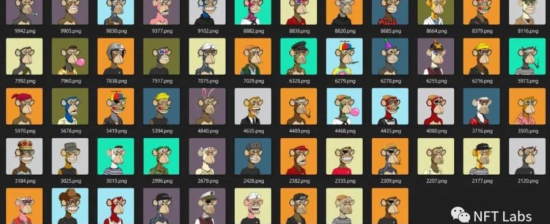 BYAC全稱是BoredApeYachtClub,是由一萬個猿猴NFT組成的收藏品,包括了帽子,眼睛,神態,服裝,背景等170個稀有度不同的屬性。通過編程方式隨機組合生成了1萬個獨一無二的猿猴,每個猿猴表情神態穿著各異。興起緣由