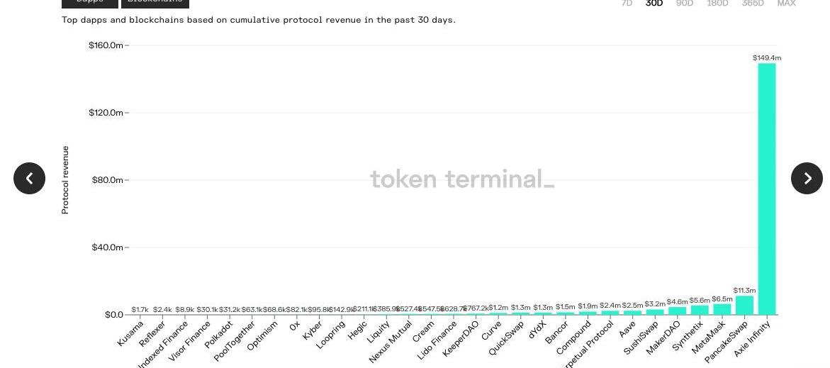 TokenTerminal數據顯示,AxieInfinity過去一個月的協議收入高達1.49億美元,以十余倍的差距甩開了MetaMask、Maker、Compound等不同賽道的龍頭項目們。