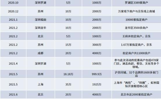 資料來源:公開信息而從政策數量而言,深圳優勢明顯,據不完全統計,今年以來,深圳共發布5條市級層面的政策推動數字人民幣應用,除了在工作報告、十四五規劃外,先后在《深圳市人民政府關于加快智慧城市和數字政府建設的若干意見》、《深圳市數字經濟產業創新發展實施方案》以及《關于支持羅湖區黃金金融發展的若干措施》中提及數字貨幣。上海、蘇州名列第二,推出了3條政策,除了工作報告與規劃外,分別在《關于加快建設上海國際消費中心城市持續促進消費擴容提質的若干措施》與《蘇州市推進新型基礎設施建設行動方案》引導數字人民幣試點。而北京與成都,則相對于其他城市,相關市級政策發布較少,目前僅在2021年工作報告與十四五規劃中有所涉及。