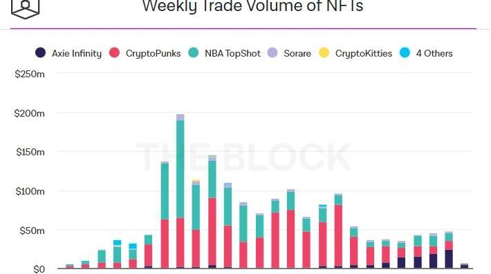 NFT是加密貨幣行業在出圈和市場契合度兩方面的完美結合案例。在2021年上半年中,我們見證了NFT領域的崛起,但我們都知道這只是NFT潛在市場的冰山一角,這還只是個開始,未來NFT將在數字藝術、區塊鏈游戲、資產流動性解決方案等方案大放異彩。根據TheBlock的數據統計,2021年上半年NFT主流市場的周交易量一路穩定增長,在2~3月份周交易量達到了高峰值近2億美元,Beeple的NFT作品《Everyday》就是在3月11日以6930萬美元的價格售出的;隨后NFT市場從狂熱中逐漸恢復理性,再加上后面幣圈市場行情的冷淡,NFT的周交易量有所回撤,但目前也穩定在4000萬美元左右。