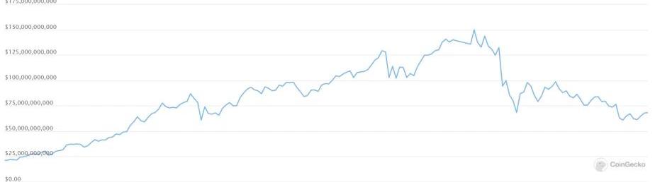 BTC市值占比Ð\\BTC匯率而ETH社區在EIP-1559以及未來PoS大合并這種升級優化信心下,再次喊出了“超越比特幣”的口號,ETH\\BTC的匯率也十分配合,最低從0.025一路上漲,最高上漲到0.08,只可惜革命完成一半,以太坊市值想要超越比特幣,匯率至少得上漲至0.16。根據CoinGecko的數據統計,2021年上半年DeFi代幣總市值從近219億美元上漲至683億美元,漲幅約高達312%,期間總市值最高達到1500億美元。