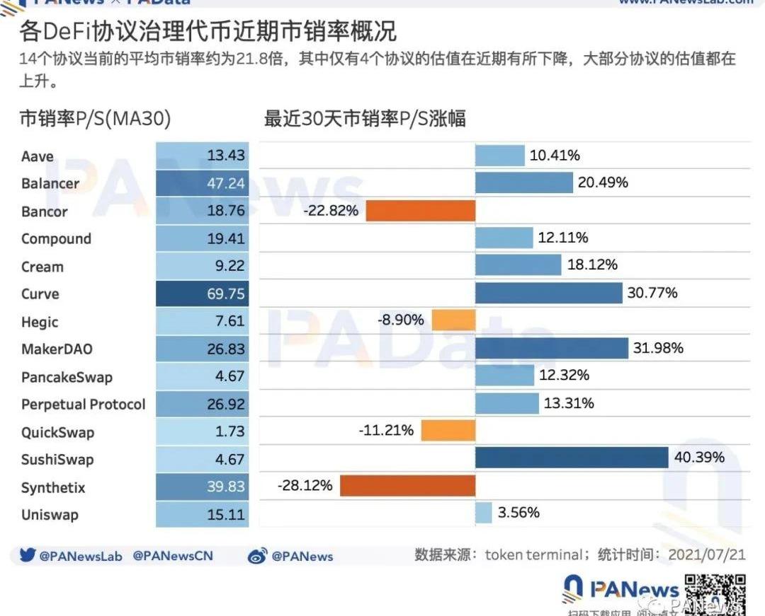 通過DeFi協議治理代幣稀釋后的市值與總營收額之比可以對協議進行估值,這就是市銷率。一般情況下,市銷率越底,估值越低,越有投資潛力,但這也受到代幣初始經濟模型的影響,所以,需要聲明的是,市銷率估值模型對DeFi協議只有適度參考性。根據統計,14個DeFi協議最近30天的平均市銷率約為21.8倍。其中市銷率最高的是Curve,達到了69.75倍,其次,Balancer和Synthetix的市銷率也較高,都超過了40倍。另外,市銷率較低的有Cream、Hegic、PancakeSwap、QuickSwap和SushiSwap,都不足10倍。