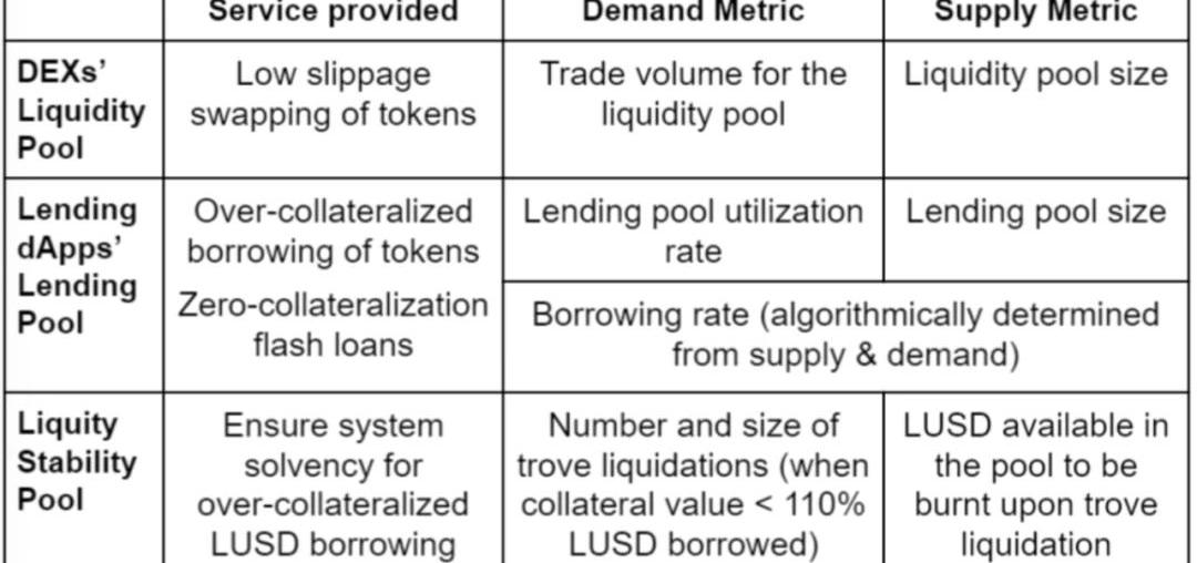 流動性池使dApp能夠向用戶提供服務并收取費用,從而產生收入。然后,這部分收入將分配給流動性提供者。由于協議通常也會將收入分配給其他利益相關者,因此了解收入共享結構以及作為LP用戶得到了多少收入是很重要的。收入通常與:治理代幣的持有者(通常通過銷毀代幣供應,這是傳統金融中股票回購的概念)協議儲備(儲備可能有預先確定的特定用途,或者可能由治理代幣持有者監督)協議開發團隊LP的預期費用收入可以看作是流動性池中供求關系的函數。更高的需求會增加收入,而更大的供給(池規模)意味著收入必須在更多人之間分享。