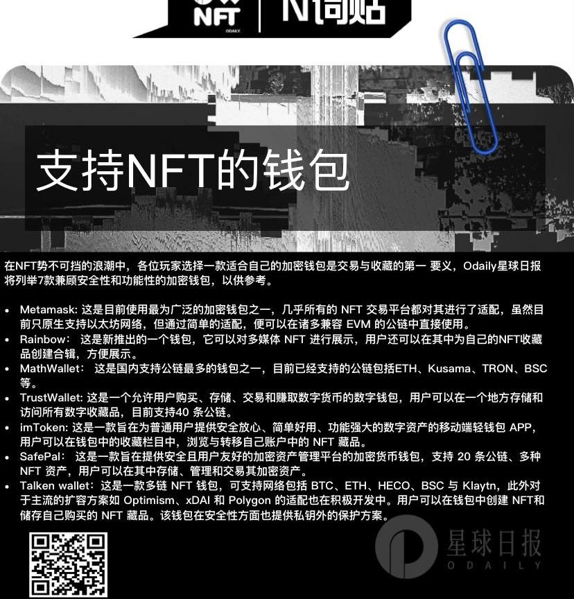 在NFT勢不可擋的浪潮中,各位玩家選擇一款適合自己的加密錢包是交易與收藏的第一要義,Odaily星球日報將列舉7款兼顧安全性和功能性的加密錢包,以供參考。Metamask:這是目前使用最為廣泛的加密錢包之一,幾乎所有的NFT交易平臺都對其進行了適配,雖然目前只原生支持以太坊網絡,但通過簡單的適配,便可以在諸多兼容EVM的公鏈中直接使用。Rainbow:這是新推出的一個錢包,它可以對多媒體NFT進行展示,用戶還可以在其中為自己的NFT收藏品創建合輯,方便展示。MathWallet:這是國內支持公鏈最多的錢包之一,目前已經支持的公鏈包括ETH、Kusama、TRON、BSC等。TrustWallet:這是一個允許用戶購買、存儲、交易和賺取數字貨幣的數字錢包,用戶可以在一個地方存儲和訪問所有數字收藏品,目前支持40條公鏈。imToken:這是一款旨在為普通用戶提供安全放心、簡單好用、功能強大的數字資產的移動端輕錢包APP,用戶可以在錢包中的收藏欄目中,瀏覽與轉移自己賬戶中的NFT藏品。SafePal:這是一款旨在提供安全且用戶友好的加密資產管理平臺的加密貨幣錢包,支持20條公鏈、多種NFT資產,用戶可以在其中存儲、管理和交易其加密資產。Talkenwallet:這是一款多鏈NFT錢包,可支持網絡包括BTC、ETH、HECO、BSC與Klaytn,此外對于主流的擴容方案如Optimism、xDAI和Polygon的適配也在積極開發中。用戶可以在錢包中創建NFT和儲存自己購買的NFT藏品。該錢包在安全性方面也提供私鑰外的保護方案。