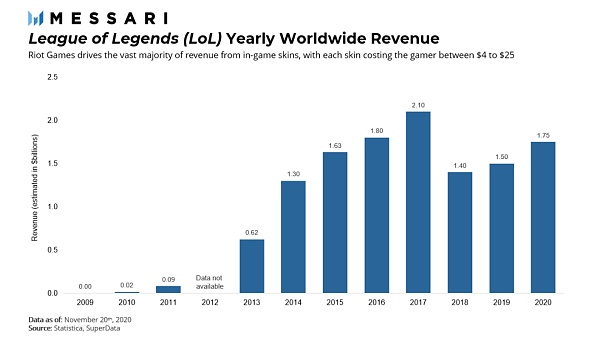 上圖:《英雄聯盟》每年全球收入情況,數據截至2020年11月20日。來源:Statistica, SuperData