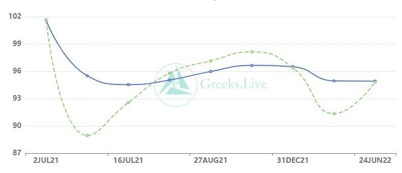 播報數據由Greeks.live格致數據實驗室和Deribit官網提供。時間總是過得很快,一轉眼今年的第二個季度交割已經結束了,這意味著今年的交易日已經過去了一半。今年的第一季度行情突破了大家的想象,第二季度讓大部分人失望,比特幣市場就是這樣,什么都有可能發生,要對所有可能做出準備。期權成交量4.76億美元,期權持倉量為40億美元。10d107%30d100%90d91%1Y75%各標準化期限隱含波動率:今日:1m96%,3m97%,6m96%,DVol103%6/25:1m90%,3m93%,6m94%,DVol101%BTC交割后迎來一波下跌,目前在32000美元橫盤,這和近幾個月交割后拉升的直觀規律不同。由于再次跌到下沿,主要期限IV受恐慌影響上升,短期IV大幅上升。