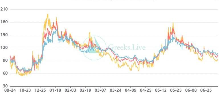 以太坊期權成交量1.6億美元,持倉量24億美元。10d105%30d106%90d139%1Y109%各標準化期限IV:今日:1m99%,3m105%,6m107%7/8:1m97%,3m104%,6m107%以太坊回調一度接近2000美元關口,目前回到2100附近的波動價格區間下方,主流幣這種不斷試探前低的走勢非常容易崩盤,各期限期權IV小幅上升。