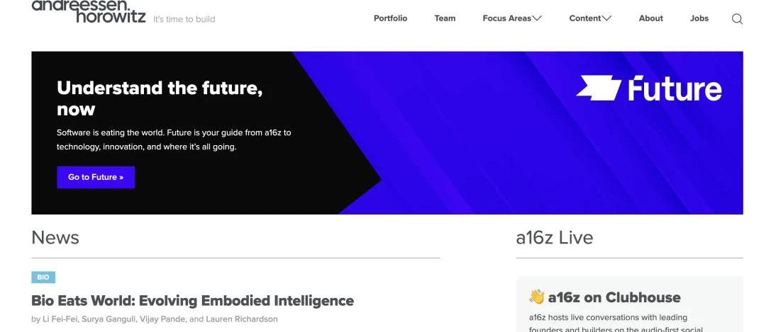 比起硅谷投資機構這一身份,a16z更像是一個媒體帝國。2011年,a16z以8000萬美元投資Twitter,由此成為首家同時持有Facebook、Groupon、Twitter和Zynga四家當時估值最高的社交媒體公司股票的機構。a16z從建立之初就非常重視通過媒體渠道營銷造勢,除了積攢和吸納傳統媒體、記者資源之外,創始人安德森更是頻繁地在社交媒體上露臉、在推特上大肆發表評論,通過各種營銷手段打響名氣的同時,也為其資金募集助力。a16z原合伙人本尼迪克特·伊萬斯在2015年開玩笑地說:a16z是一家通過風險投資盈利的媒體公司。然而,隨著自媒體的興起,a16z開始逐漸擺脫對傳統媒體資源的依附,取而代之的是主動下場,成立自己的內容團隊和媒體品牌,以從業人員視角用更加積極的基調進行內容報道。a16z與傳統機構媒體的裂痕早已不是一朝一夕,事實上,安德森等a16z高層早就對傳統媒體怨念頗深,認為他們既無知又自傲,本就缺乏對行業的深度了解,又傾向于寫負面報道博取眼球,缺乏正向的引導和真正有價值的發言。2015年的“Theranos騙局”風波成為了a16z與機構媒體的導火索。當時,a16z力捧的血液檢測公司Theranos被《華爾街日報》曝出是一個騙局,整個硅谷科技圈嘩然。為此,盡管a16z不得不多次出面解釋,但質疑聲依然紛至沓來,這使得他們意識到,必須要打破傳統機構媒體的壟斷,創造一個直接與用戶溝通、發表觀點的渠道,把報道的權力讓給真正懂行的人。如果你打開a16z的官網,可能會誤以為打開了某個科技媒體的頁面,在網站最醒目的位置寫著——了解未來,現在。這是a16z打造的媒體平臺Future。網頁下方,依然是各類內容板塊——新聞、Clubhouse直播、播客。