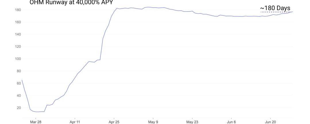 數據來源:沙丘分析考慮到DAO控制的每1個DAI只能發行1個OHM,我們可以理解如何存在如此高的APY/代幣通脹。因此,我們可以計算出OHM在當前的APY和DAI所有權下可以持續多長時間。在40000%的年利率下,在OHM的數量等于金庫中DAI的數量之前,OHM可以在金庫的當前價值下繼續發行180天。隨著金庫規模的增加,這條跑道將繼續保持平穩或增加。