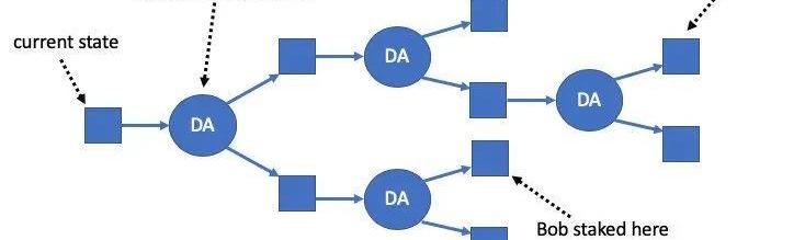 新ArbitrumRollup協議解決了這兩個缺點。多個DA可以被“流水線化”,這樣VM就可以像驗證節點模擬VM的計算一樣快速地進行。第二,正如我們將在下面看到的,一個“惡意行為者不能減緩進展,他們只能暫時推遲鏈上對結果的識別,對于誠實行為者來說,這些結果已經是“去信任的結果”。這是怎么做到的呢?每個狀態最多可以有一個DA跟隨它。如果一個DA沒有跟隨狀態,那么任何人都可以創建一個跟隨它的DA,從而創建一個新的分支點。其結果可能將會是一棵可能的未來樹。
