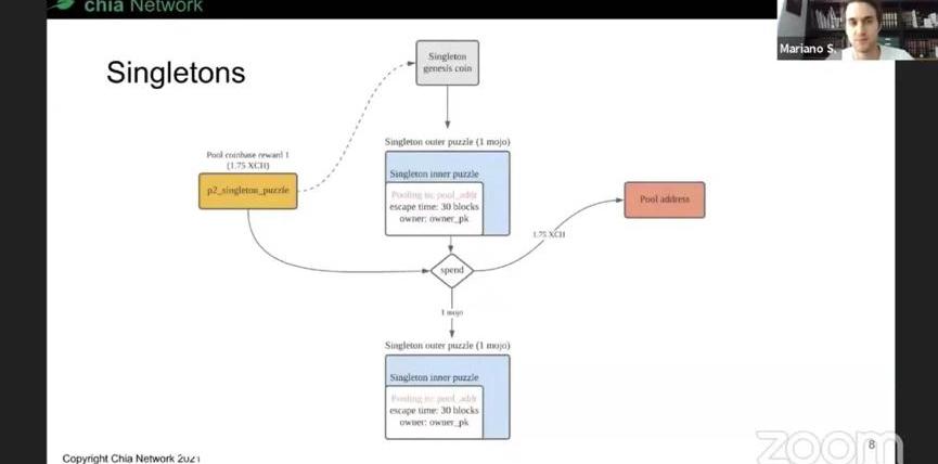 為農民保障安全:農民無需信任耕種池,農民也絕不需要向耕種池上傳他們的私鑰,這些私鑰全部都保存在本地。由于在工作量證明機制中的礦池不涉及到私鑰,礦工只需不斷進行哈希碰撞并將其提交,以此贏取獎勵,礦工需將自身算力投入礦池,所以其中不存在作弊行為。然而在Chia的空間證明機制中由于涉及到私鑰去創造簽名,其農民并不與耕種池進行綁定,因此理論上農民在可以贏取Chia的同時又去對另一方進行簽名,出現多挖作弊的行為。為避免這種作弊行為的發生并確保其安全性,Chia的耕種池協議相對于普通的礦池協議會更復雜也更難于建設。為耕種池保障安全:P圖以加密的形式與相關智能合約進行綁定,而該合約指向某一特定耕種池,由此便可以防止農民作弊。1.75/.25獎勵分割機制也會有效抵御耕種池之間的攻擊行為。在目前的版本中,P圖里加密存儲了公鑰。團隊曾試圖將耕種池地址加密存儲至P圖中,以此防止農民的多挖作弊行為,然而這種做法會讓農民無法更換耕種池,一旦P盤完成,他們就只能固定加入某一特定耕種池中,這不僅非常不方便,而且還會導致耕種池趨向中心化。最終團隊決定使用智能合約去綁定耕種池地址,從而有效解決了上述問題。區塊創建更為去中心化:農民們可以選擇運行自己的全節點,從而助力去中心化,也可以選擇代理耕種池為自己運行全節點。可自由更換耕種池:農民可以隨時更換耕種池,無需重新P盤,同時確保農民無法為贏取更多獎勵而對耕種池作弊。不涉及“注冊”、“用戶名”和“密碼”等,農民可以直接在鏈上更換耕種池并直接開始耕種。無需重復配置的區塊鏈備份系統:假設某農民擁有A和B兩臺計算機,這兩臺計算機中用到同樣的key,那么只要其中一臺計算機加入了某耕種池,則另一臺計算機就會自動加入該耕種池并進行耕種,無需重復手動進行配置。什么是Singleton?