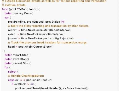 主循環loop具體實現代碼如下,它是txPool的一個goroutine,也是主要的事件循環,它主要用于等待和響應外部區塊鏈事件以及各種報告和交易驅逐事件: