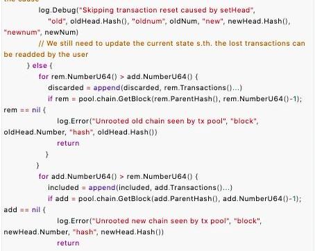 如果老區塊不為空且老區塊不是新區塊的父區塊,則檢查老區塊和新區塊之間的差值是否大于64,如果超過64則不進行重組,否則獲取舊頭和新頭的最新區塊,如果舊頭為null則檢查新頭的高度是否小于舊頭的高度,則打印日志并直接return,如果不滿足則繼續向下執行;如果舊頭不為null則開始進行重組,此時如果舊鏈的頭區塊大于新鏈的頭區塊高度時則舊鏈先后回退并回收所有回退的交易,如果新鏈的頭區塊大于舊鏈的頭區塊則新鏈后退并回收交易,當新鏈和舊鏈的到達同一高度時則同時回退直到找到共同的父節點,之后找出所有存儲在discard里面但是不在included里面的值,之后將這些交易重新插入到pool里面: