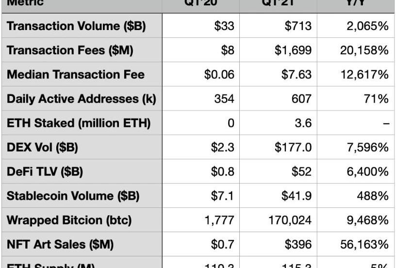 如果你要看好以太坊,首先你需要相信它會存在很長時間,越來越多的人會繼續使用它,其他人也相信這些事情要真實。那么你會很欣慰地知道,以太坊是區塊鏈中的Excel。這不完全正確。這個比喻在某些地方被打破了。但就我們的目的而言,這已經足夠了。以太坊是一個圖靈完備、可編程的區塊鏈,任何人都可以使用智能合約構建成熟的應用程序。人們可以在以太坊之上構建各種去中心化應用程序,提供從安全到身份再到支付的一切。去中心化金融(DeFi)應用程序、NFT市場、去中心化自治組織(DAO)以及游戲和虛擬世界都可以建立在以太坊之上,所有這些都由ETH提供支持。這種靈活性真的很難做到。在《Excel永不死亡》一文中,BenRollert和我寫到Excel在技術領域的持久力,通常每隔幾年就會看到新產品取代舊產品。我們寫道:如果說從EXCEL中可以學到什么核心的產品設計經驗,那就是將可用性和靈活性結合起來既非常困難,又非常有益;開發人員的設計原則是讓任何一件軟件真正擅長一件特定的事情,故意將其功能限制在特定的領域。Excel是這條規則的一個值得注意的例外——它相當于一種具有大量選擇的手機,顯然數億人確實想要為它作曲。你可以將「Excel」替換為「以太坊」,并且效果很好。除了產品理念之外,兩者之間還有一些特定的相似之處,包括圖靈完備性、可組合性。圖靈的完整性和可組合性共同意味著你可以構建智能合約來計算任何內容,然后將它們鏈接在一起以更快地構建日益復雜的事物。使發動機加速需要時間,但是一旦它移動,它就會快速移動。這正是正在發生的事情。經過多年在加密貨幣冬天相對默默無聞的建設,面對這些東西是否有任何實際用途的懷疑,2020年和2021年初見證了以太坊生態系統的實際用例爆炸式增長。在以太坊宣布2021年第一季度的數據中,JamesWang制作了一個圖表,突出了今年的進展: