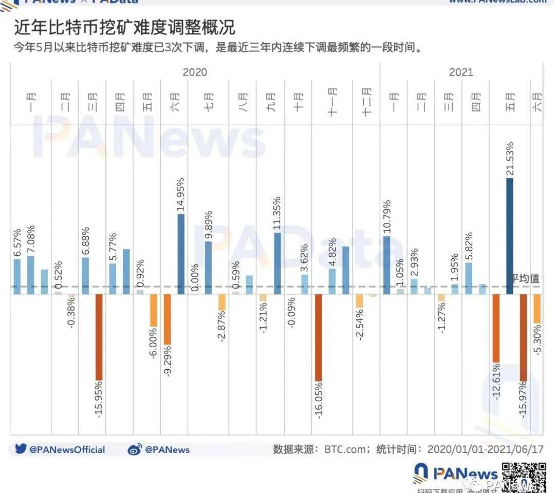 全網算力下跌后挖礦難度也隨之下調,根據統計,截至6月17日,今年比特幣網絡累計難度調整12次,其中上調8次,下調4次。而下調的4次中有3次都出現在最近一個多月中,分別是5月12日下調12.61%、5月30日下調15.97%、6月14日下調5.30%,近期也是最近三年內挖礦難度短期下調頻率和幅度最大的一段時間。