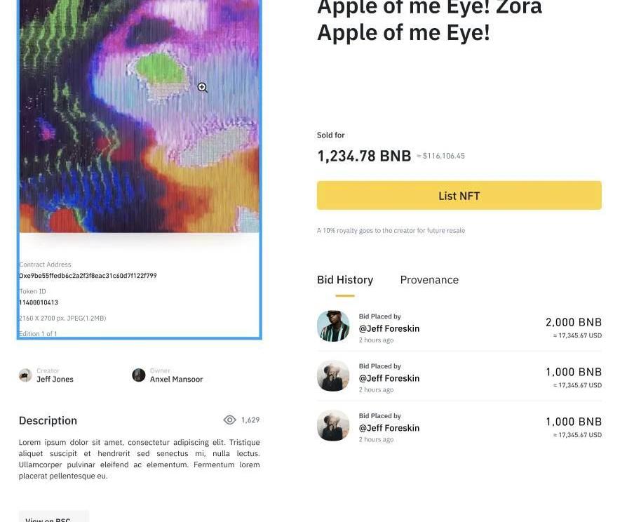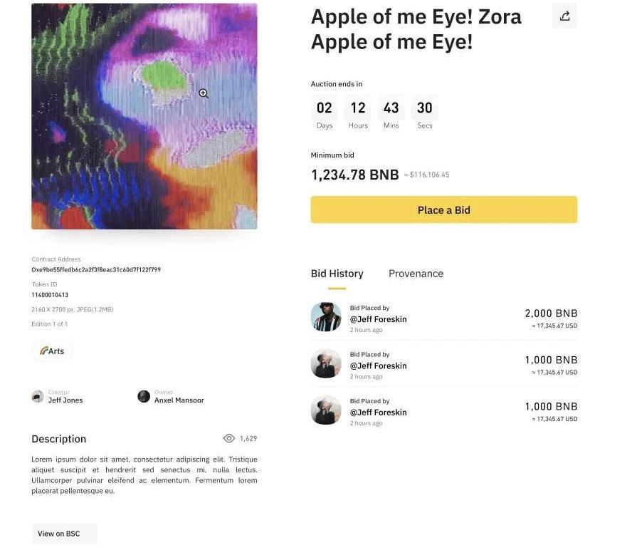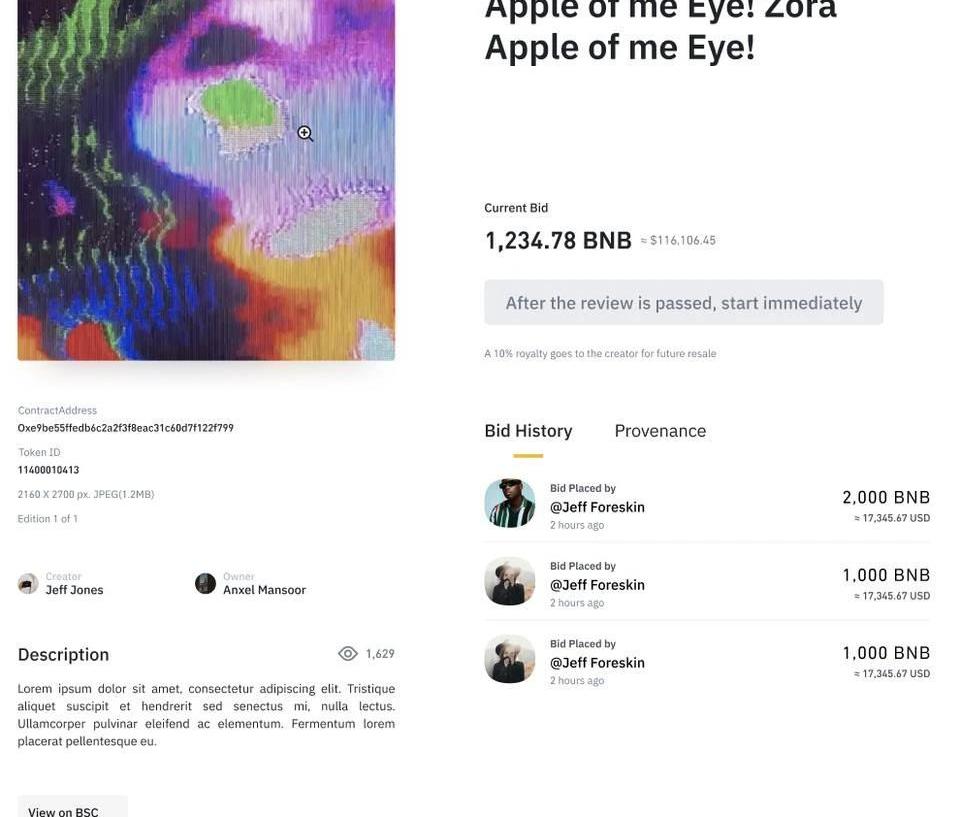除了鑄造NFT外,BinanceNFT市場還允許用戶直接購買已上架的NFT。幣安用戶可通過參與拍賣或以固定價格直接購買兩種形式參與,目前已支持BNB、ETH以及BUSD等多種加密貨幣支付。NFT的創造者以及那些將已有的NFT作品導入平臺的創作者都可在該作品的所有交易中獲得1%的分成。如何參與NFT拍賣拍賣形式并不難理解,在限定時間內出價最高者即可購得以拍賣形式出售的NFT作品。在詳情頁中可以查看NFT的描述、圖像、投標歷史記錄和其他細節。單擊「提交投標」按鈕即可確定提交投標。