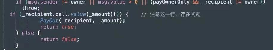 對_recipient發出.call.value調用,轉賬_amount個Wei,.call.value調用默認會使用當前剩余的所有gas。