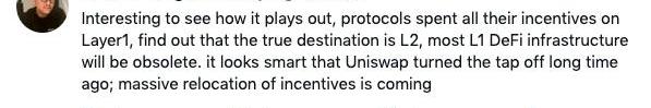 Layer2的競爭是技術的競爭,更是生態的競爭,關于這一點,Polygon就是最好的例子,在Aave、Curve、Sushiswap、1inch等以太坊生態龍頭DeFi的加持下,Polygon在Rollup方案尚未落地的情況下,靠著側鏈+Plasma的“舊輪子”跑出了百億美元的流通市值。而作為以太坊DeFi的第一龍頭,Uniswap是否會選擇Optimism之外的其他Layer2也一直是社區熱議的話題。在本周之前,Uniswap一直保持著對Optimism的“忠貞不渝”,即便后者已經主網上線時間推遲了數月,這也導致部分社區成員開始猜測雙方背后共同的投資機構是否在就此施以壓力。