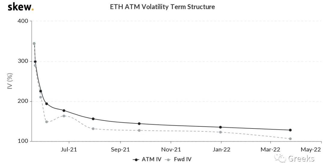 以太坊期權成交量11億美元,持倉量43億美元。10d232%30d165%90d120%1Y100%各標準化期限IV:今日:1m177%,3m151%,6m139%5/19:1m128%,3m127%,6m125%以太坊是這波牛市的龍頭,也是昨天519閃崩的發動機,昨晚一度跌破了2000美元。因為數個DeFi的暴雷,以ETH為基礎的多個項目都遇到了拋售,這直接影響著ETh本身的定價,市場還沒有完全消化。超短期IV爆炸拉升至250%,各主要期限IV也都明顯上升至150%上方。以太坊期權的賣方非常受傷,現在市場需要真金白銀的支撐。