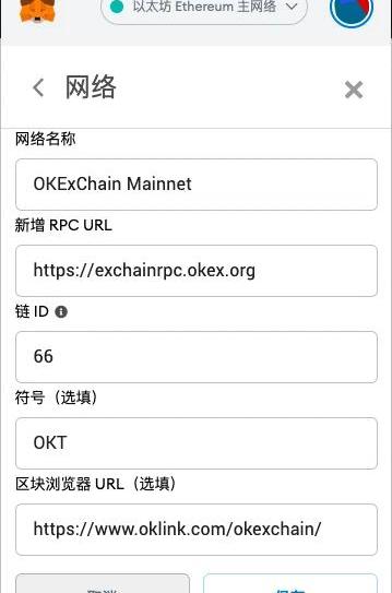在彈出的表單中輸入下列信息:網絡名稱:OECMainnet新增RPCURL:https://exchainrpc.okex.org鏈ID:66符號:OKT區塊鏈瀏覽器URL:https://www.oklink.com/OEC/