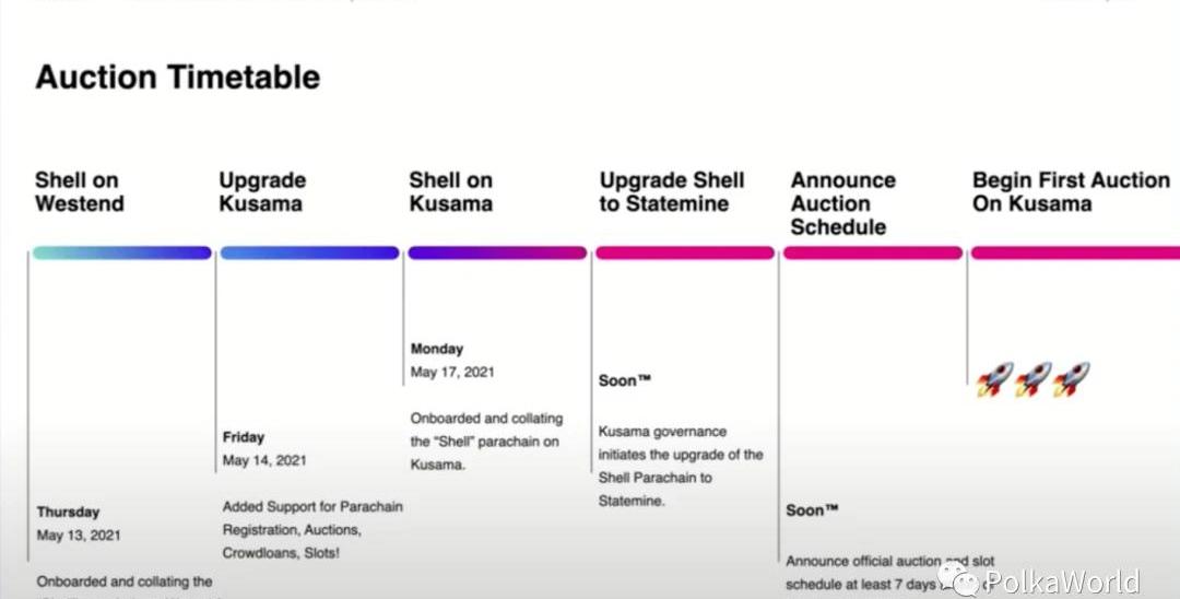 上周四,我們在Westen測試網上線了Shell鏈。上周五,我們升級了Kusama,讓其支持平行鏈注冊、拍賣和眾貸流程,所以這些功能其實都已經在Kusama上了。這周一,我們將Shell鏈上線到了Kusama。接下來馬上會發生的事,包括將Shell鏈升級為Statemine,也就是Kusama的資產鏈,它跟Statemint差不多,不過是在Kusama上的。等Statemine運行順利后,我們會宣布官方的拍賣時間表。當然我們會提前給到你7天的時間,讓你可以去解綁你Staking的KSM。Kusama的拍賣時長Kusama的拍賣將持續7天,其中兩天是開放出價期,5天是隨機結束期。這應該會讓團隊有足夠的出價和眾貸的時間,也會讓參與者有足夠的參與Kusama眾貸的時間。拍賣計劃