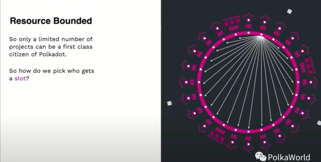 我們確實有一個長期計劃,通過使用“嵌套中繼鏈”來解決這個可擴展性問題。你可以想象有一條跟波卡差不多的中繼鏈,但是它同時又作為平行鏈連接到波卡中,所以你就可以嵌套,可以繼續去擴展這個去中心化網絡。不過這些都是未來的計劃了。今天的演講,我們來聊一下如何選出那些能夠連接到波卡網絡的幸運的平行鏈。2、插槽插槽就是我們用來描述平行鏈可以連接到波卡的機會一個術語。插槽分配情況樂觀地來講,我們認為波卡上一次性最多可以支持100條平行鏈,所以說我們需要100個插槽。每一個插槽之間都是平等的。