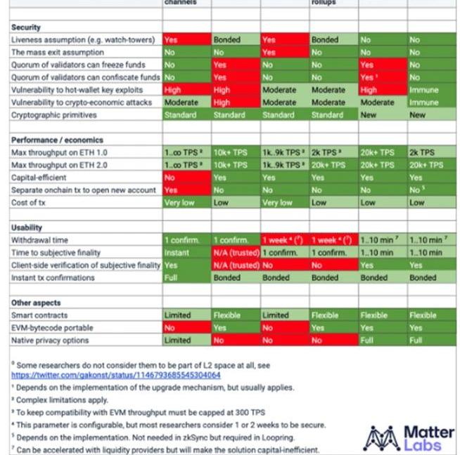 每種擴展解決方案本身并不會為用戶提供這種可選項。而是提供速度,成本和安全性的各種組合。然后,開發人員可以根據他們的應用目的選擇他們首選的解決方案。當前有四種最廣泛使用的解決方案:1)側鏈,2)等離子,3)樂觀匯總,4)zk匯總。MatterLabs的這張表讓我們很好地了解了這些解決方案的堆疊方式以及開發人員在為其項目構建項目時所具有的選擇。