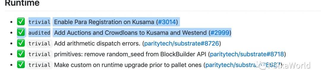 這個版本部署了代碼審計后的平行鏈、拍賣和眾貸功能。這意味著,在投票通過并執行之后,Kusama網絡就正式啟動了平行鏈功能,以及拍賣和眾貸的功能!
