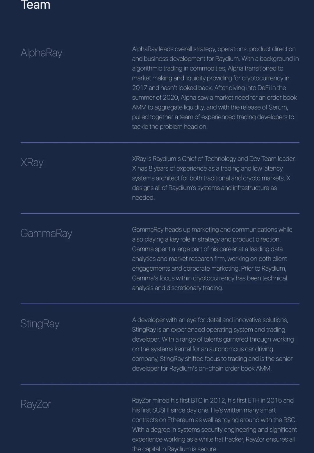 AlphaRay在談到團隊的融合背后的故事時坦言,我們的團隊在加密貨幣量化交易及做市商領域擁有多年的經驗,并且是頭部交易所排名前20的交易員。去年我們看到了在Serum上構建一個真正訂單簿形式的自動化做市商系統能夠帶來的機會,這將重新定義普通DeFi用戶在去中心交易所上的交易體驗。想到我們在Serum和Solana生態中建立的自動化做市商系統所能夠解決的難題,我們隨即投入項目的開發工作中,Raydium就此誕生。