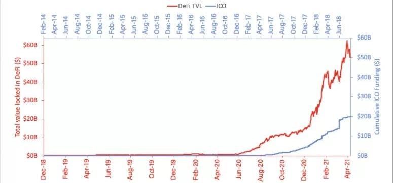 以太坊DeFi總鎖倉量與ICO融資額對比圖在這張數據取自DeFiPulse,反映以太坊的DeFi總鎖倉額和ICO總金額的對比圖顯示,18年底至2020年6月,這兩個數字大致持平。2020年6月以后,前者開始將后者遠遠甩開。如今二者的差距也在不斷拉大。2020年被稱為是“DeFi之夏”,但是現在的市場明顯擴大了。舉例來看,以太坊的總鎖倉量第一次突破10億美元是在2020年2月,同年9月突破了100億美元。在這個月前期,Compound公鏈上的總鎖倉量也已經突破了100億美元。4月27日左右,算法穩定幣項目MakerDAO的總鎖倉額也首次突破了100億美元。聚合理財平臺Yearn.Finance核心開發者banteg也發推表示,Yearn的總鎖倉額也達到了29.54億美元。