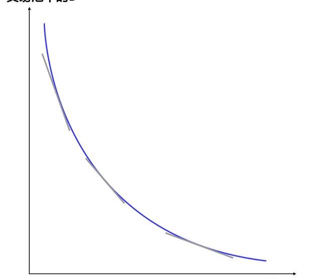 從P1點到P2點,從Q1到Q2,B需求下降相等,而Q的需求增加明顯不同。P1到P2時A的需求增加更少,Q1到Q2時A的需求增加更多。這就是邊際替代效應遞減。隨著B需求的減少,需要要用更多的A需求來代替B需求。對于AMM交易模型中的兩種幣而言,是同樣的道理。用戶用A去兌換B,交易池中的A增加,B減少,也就是點在曲線上向右下方移動。我們可以看見,隨著點向右下方移動,曲線的斜率在減少。這意味著隨著池子中B的減少,B/A的價格在增加。反之,當點在曲線上向左上方移動時,曲線的斜率在增加。這意味著隨著A的減少,A/B的價格在增加。